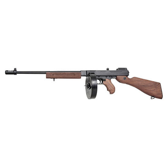 Shooter’s Model are 100% New in the Box products that may have a slight finish imperfection. The slight imperfection would occur during the manufacturing process and are typically very hard to see except to the well-trained eye or with a magnifier. – Thompson 1927A-1 Deluxe Semi-Auto Case Hardened Finish with Clear protective coat – Caliber: .45 ACP – Barrel: 16.5 Finned (with compensator 18) – Weight: 13 lbs. – Length: 41 overall – Sight: Blade front open rear adjustable – Finish: Blued Steel – Stock: Walnut fixed stock and Horizontal foregrip – Magazines: 1x10rd Drum – Warranty: 1 year