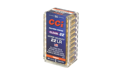 Now you can get all the benefits of exclusive Clean-22 technology with the flat trajectories and power of an extreme-velocity load. New CCI Clean-22 Hyper Velocity clocks in at 1,550 fps, while the advanced polymer coating on the 31-grain lead round nose bullet reduces fouling, especially in suppressed rimfires.