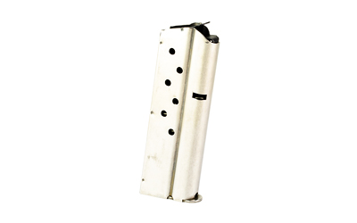 Stainless steel 8-round magazine for 1911 9mm pistols with compact grip. Pre-drilled for base pad installation.