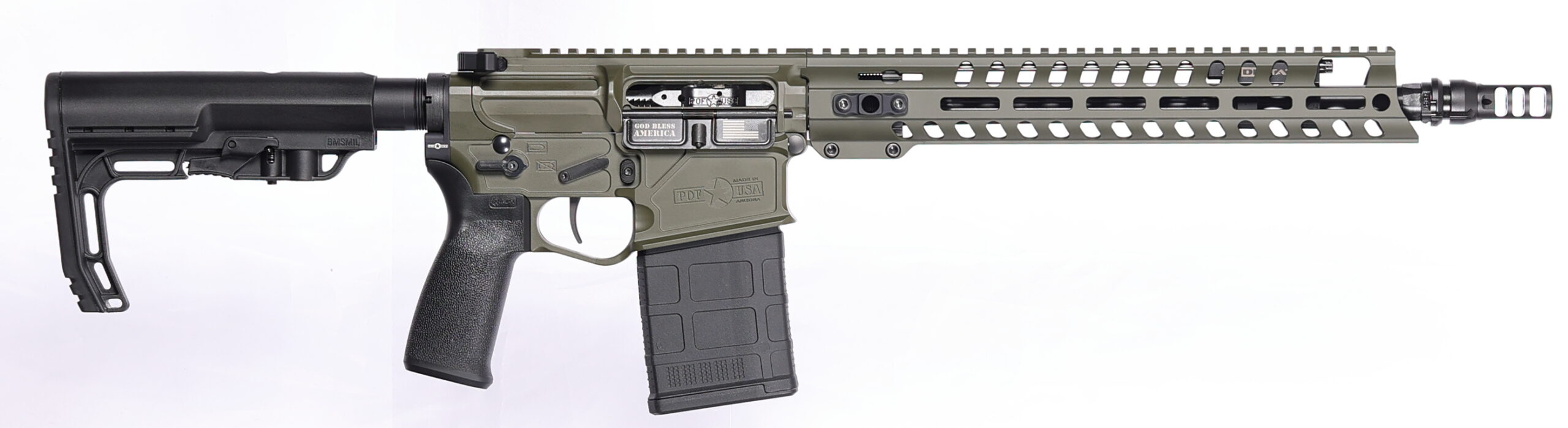Nitride 13.75 Barrel – Pinned & Welded Dead Air Keymo Muzzle Break for Overall Length of 16.1 – Mid-length Gas system – 1-10 Twist 5R Right Hand lands/grooves – 13 Renegade rail system – Dictator Adjustable Gas Block – Dead Air Keymo Muzzle Break