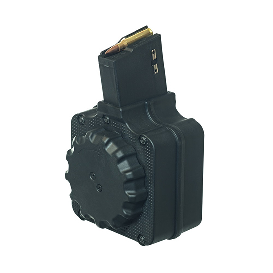 50-round drum Magazine – Fits most AR-308 / .308 Cal AR type rifles using LR-308 (DPMS) or SR-25 pattern magazines – Over molded stamped steel feed lips and magazine catch – Magazine body constructed of a proprietary DuPont Zytel® based polymer – Injection molded magazine follower – Heat treated stainless steel magazine spring – Patented Design – Does not fit rifles using Armalite pattern magazines – Made in USA