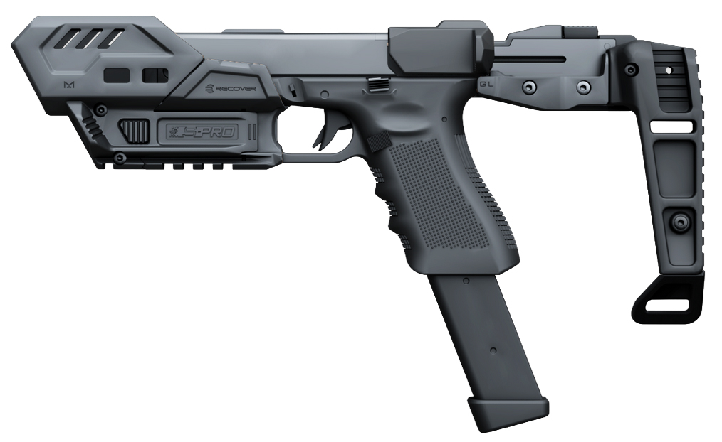 S-PRO is our next-level pistol conversion kit featuring a spring-loaded stabilizer (which can be converted to a buttstock by removing the included brace attachment) MLOK mounting options and broad compatibility. – S-Pro is compatible with Glock Canik & Walther PDP. Pre-order for SIG X Macro Large Frame Glock & Hellcat here with more to follow. The unit is designed to be modular and using it with another compatible gun will only require swapping a small adapter piece which will be sold separately. – S-PRO Key Features – Metal frame – MLOK-compatible front shroud – Push button release spring loaded stabilizer/buttstock – Modular unit swap out adapters to use the same platform for different pistols – No tools are required to install – Compatible with high-profile slide-mounted optics – Fully Compatible with these GLOCK pistols ALL GENERATIONS* G17 G19 G19X G24 G25 G26* G31 G32 G34 G45 G47 G49 Fully Compatible with these GLOCK pistols ALL GENERATIONS* EXCEPT GEN 5 SLIDES. G22 G23 G24 G27* G35 While the S-Pro Stabilizer frame itself is compatible with GEN 5 .40 G22 G23 G24 G27* G35 Glock models with these models the GEN 5 slide is not compatible with the bundled charging handle. Since the Stabilizer frame covers the slide grips you will need an alternate way to rack the slide like an RMR or some other solution. If you have a GEN 5 slide and an alternate way to rack the slide you can use the S-Pro. If you have any of these Glock models G22 G23 G24 G27* G35 WITHOUT a GEN 5 slide the S-Pro is fully compatible. * The Charging Handle is not compatible with RTF Moon Cut slides