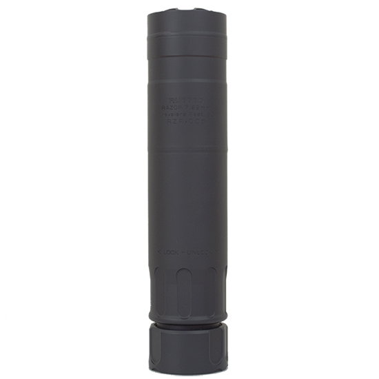 CALIBER: 7.62mm rated up-to .300 RUM – RATINGS: Belt Fed Rated – DIAMETER: 1.5 – LENGTH: 6.4 – WEIGHT: 15.3 oz – FINISH: Cerakote – SOUND LEVELS: – 300BLK: 129.7dB – 5.56mm: 138.7db – .308: 143.8db – MATERIALS: – Baffles: Cobalt 6 Alloy core – Tube: 17-4 PH Stainless Steel – Mount: 17-4 PH Stainless Steel – FEATURES – Interchangeable Front Caps (7.62mm and 5.56mm available) – Monolithic 17-4 PH Stainless Steel Mount – Quick Detach Dual Taper Locking System – Unconditional Lifetime Warranty – BELT FED RATED: Constructed entirely of 17-4PH Stainless Steel and featuring a full Cobalt 6 Alloy baffle stack the Razor is built for anything you can throw at it. – LENGTH & WEIGHT: At 6.4 long and weighing in at 15.3oz the Razor is the shortest and lightest in it’s class. – DUAL TAPER LOCK MOUNTING SYSTEM: Patent pending quick detach mounting system ensures wobble free firing. – OPTIONAL 5.56 FRONT CAPS: Optimized for 7.62 the Razor is a perfect choice for 5.56 caliber rifles and with the addition of 5.56 front caps sound suppression levels are improved. – SOUND SUPPRESSION LEVELS: Designed for maximum maneuverability and weight savings the Razor boasts respectable dB ratings 129.7dB-300BLK 138.7dB-5.56 143.8dB-308WIN