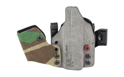 An ergonomic, mission-adjustable, RDS-compatible, multi-positional, deep concealment IWB hybrid thermoplastic holster. Its distinctive features enable concealed carry for a wide range of handgun fits from various carry positions while allowing a full firing grip prior to drawing. The design includes passive retention and adjustable tension, enabling a finely tuned fit and smooth draw. This evolution of the IncogX features a series of clips that provide more adaptability to the user while maintaining the original goals of improved grip, concealment, and function. The clips open outward and slide down with the holster, naturally locking over the belt. An actuated finger tab flexes to open, allowing quick installation or removal from the belt. An improved clip strut design combines functionality with customized concealment shims that can be easily installed or removed without tools. All IncogX models come with clip strut shims in three different concealment sizes: 1/8″, 1/4″, and 3/8″.