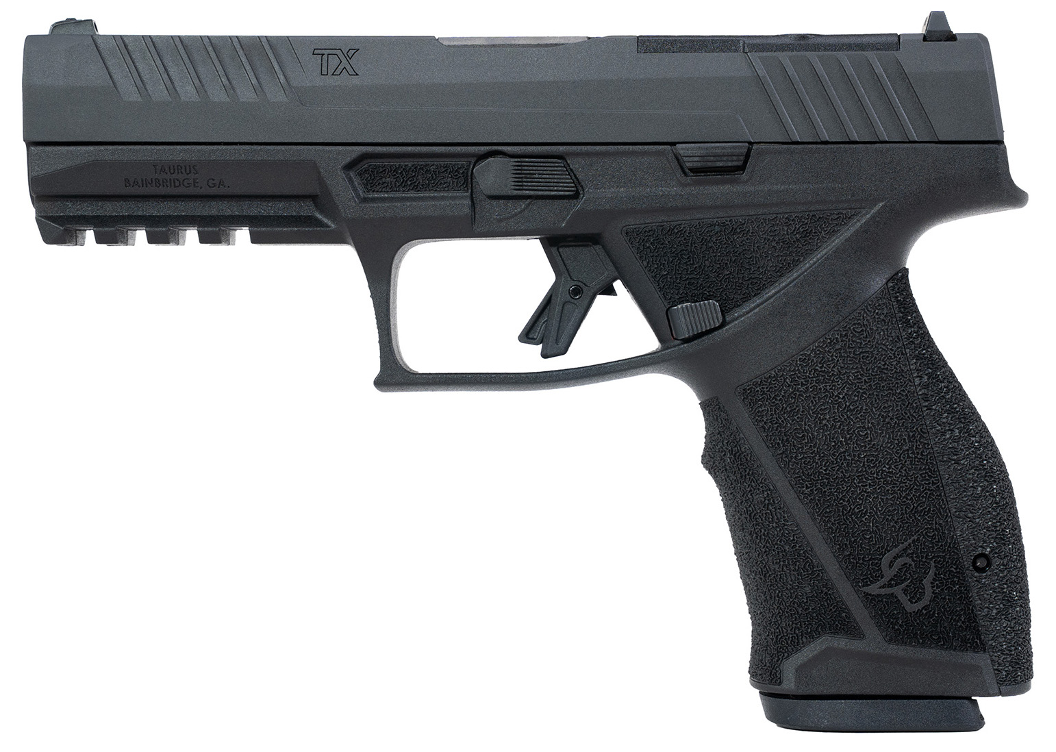 Duty Ready. That phrase defines the philosophy driving the TaurusTX9. The TaurusTX9 is designed from the ground up for the toughest environments and maximum performance. – Featuring the Taurus Modular System; a serialized modular chassis that enables end users to quickly swap frame sizes between the full size compact and subcompact. An ambidextrous slide release pairs with the reversible magazine catch accommodating both left- and right-handed shooters. The TaurusTX9 uses industry standard dovetails for its iron sights readily accepting many aftermarket options. The TaurusTX9 is Also optics-ready right out of the box utilizing the existing Taurus T.O.R.O. System. The full-size TaurusTX9 has a 4.5 inch barrel and 17+1 capacity. 4 interchangeable backstraps enable additional customization so shooters can properly fit the gun to their hands. – No matter your mission personal protection law enforcement home defense competition shooting the TaurusTX9 is Duty Ready. – The Basics – Caliber 9mm Luger – Front Sight Removable White Dot – Magazines Included 2 – Capacity 17 Rounds – Rear Sight Drift Adjustable – Action Type SAO – Special Features Striker-Fired Trigger Modular Grip Taurus Modular System Optics Ready – Tech Specs – Frame Size Full – Overall Height 5.2 In. – Overall Width 1.28 In. – Twist Rate 1:16.5in RH – Barrel Length 4.5 In. – Overall Length 7.75 In. – Overall Weight 25 Oz. (Unloaded) – Materials – Frame Material Stainless Steel – Slide Material Alloy Steel – Barrel Finish Matte Black – Frame Finish Stainless – Slide Finish Gas Nitride – Barrel Material Alloy Steel – Safety Firing Pin Block Trigger Safety