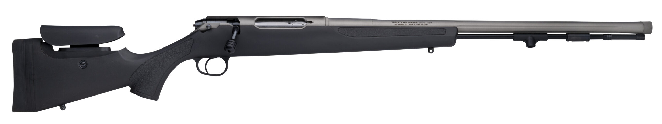 Traditions® is proud to introduce the next innovation in muzzleloading the NitroBolt®. This is the world’s first Firestick-capable bolt action. – With a 24 chromoly fluted and tapered barrel 1:24 VAPR twist 3 position safety free floating barrel pillar bedded stock patented extractor for the Firestick adjustable length of pull adjustable cheek piece 3 locking lugs cocking indicator 60 degree bolt handle.if you’re looking for features this muzzleloader has them! Accuracy just comes standard with Traditions and the NitroBolt® is built to perform. It’s already got proven performance as you will see from those who have put the NitroBolt® to the test. Traditions continues to lead the muzzleloading industry and we welcome you to the next innovation the NitroBolt®. – The NitroBolt® from Traditions® uses the Firestick encapsulated powder charge from Federal Premium®. The benefits of this revolutionary product include: – Polymer charge filled with clean-burning Hodgdon® Triple Eight powder – Charges from the breech of Traditions NitroFire rifle – Bullet loads from the muzzle – Totally impervious to moisture and the elements – Same tight tolerances and quality controls as loaded ammunition – Fast effortless loading and unloading – Shooter inserts 209 shotgun primer (not included) – NitroBolt® Features: – Uses the Federal Premium® Firestick – 50 Caliber – 24 Fluted & Tapered Chromoly Steel Barrel – 1:24 VAPR Twist Barrel – 3/4-24 Threaded Barrel For Muzzle Brake (Muzzle Brake sold separately) – 5/16-24 Thread Bolt Handle – 60 Degree Bolt – Patented Extractor for the Firestick – Cocking Indicator – 3 Locking Lugs – 3 Position Safety – Adjustable Cheek piece (12 positions of adjustment) – Adjustable LOP (adjustment from 14.5-13.75) – Pillar Bedded Stock – Free Floating Barrel – Bolt can be disassembled in seconds for cleaning with allen key and cleaned in a few minutes – Drilled & Tapped for a Scope – Solid Aluminum Ramrod – Quick-T Ramrod Hanlde – Comes with a Base